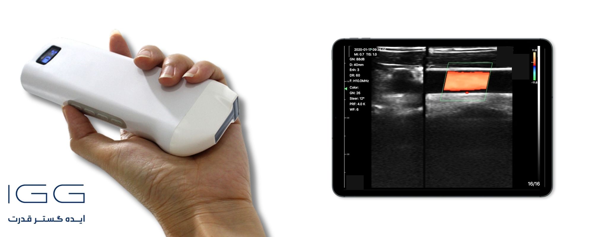 محدوده Gain از 30 تا 105 دسیبل و Dynamic Range از 40 تا 110 امکان تنظیم دقیق کنتراست و وضوح تصویر را فراهم میکند. تصاویر و ویدئوها میتوانند در فرمتهای jpg، png، mp4 و DCM ذخیره شوند و با فریم ریت 18 فریم بر ثانیه، تصویری روان و بدون تأخیر ارائه میدهند. باتری داخلی پروب تا 3 ساعت کار مداوم را پشتیبانی میکند و شارژ آن با کابل USB یا به صورت بیسیم و در مدت 2 ساعت انجام میشود. ابعاد کوچک پروب 156×60×20 میلیمتر و وزن 200 گرم آن استفاده طولانی و راحت را ممکن میسازد و با اتصال وایفای 802.11g/20MHz/5G با سرعت 450 مگابیت بر ثانیه، به موبایل، تبلت، لپتاپ و یا مانیتورهای سونوگرافی انتقال تصویر به راحتی انجام میگیرد. باکس آنتی شوک این دستگاه حمل و نقل آن را بسیار مطمعن و آسان کرده است.